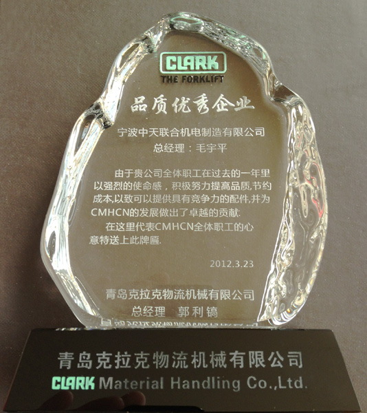 在本月召開的青島克拉克物流機械有限公司供應商會議中,中天公司在30多家供應商中憑借優秀的質量、成本及交貨率被評為品質優秀企業。此次會議共設兩名優秀供應商,中天公司為獲得此殊榮的兩家企業之一。